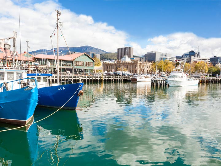 Small blue boats docked at Hobart.